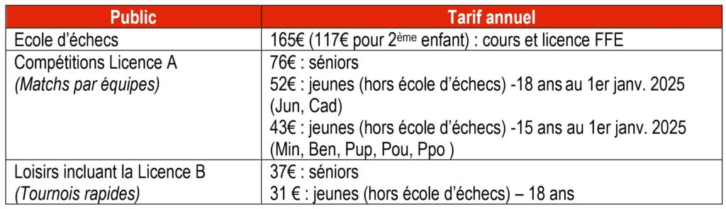 Le jeu d’échecs est un jeu millénaire combinant tactique et stratégie que vous pouvez pratiquer, quel que soit votre niveau, en loisirs ou en compétition (licence prise par le club auprès de la Fédération Française des Echecs) :